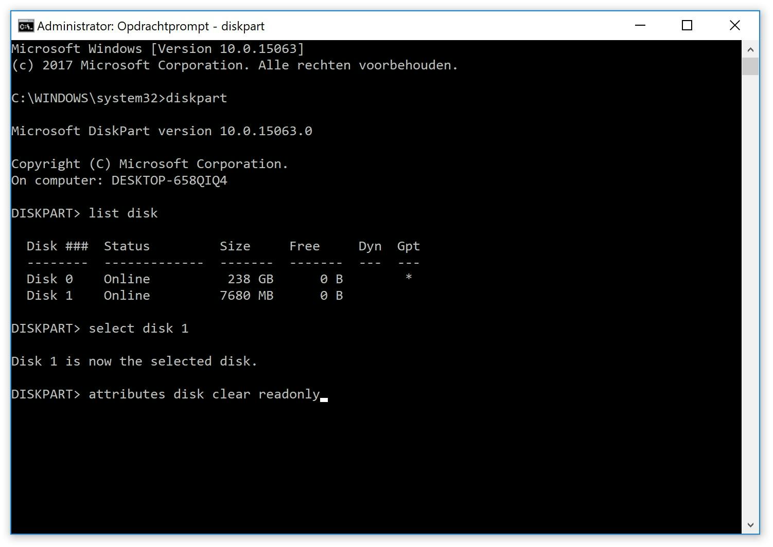 select disk [nummer] (kies hier het nummer dat hoort bij de drive waarvan je de schrijfbeveiliging wilt opheffen)