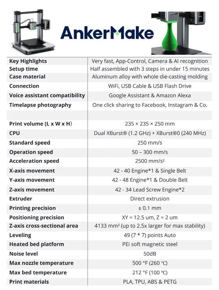 Mensen met een 3d-printer weten dit allang. Maar als je grote objecten wil printen, dan kan dat zomaar een dag duren. Aangezien de Anker-printer dus tot vijf keer sneller is, kan een product binnen enkele uren al klaar zijn voor gebruik. Uiteraard is dit afhankelijk van wat je print en hoe groot dat ding is; sommige kleine objecten zijn namelijk altijd snel uitgedraaid. De maximale omvang van producten is 235 bij 235 bij 250 millimeter. Dat is geheel volgens de marktstandaard.
