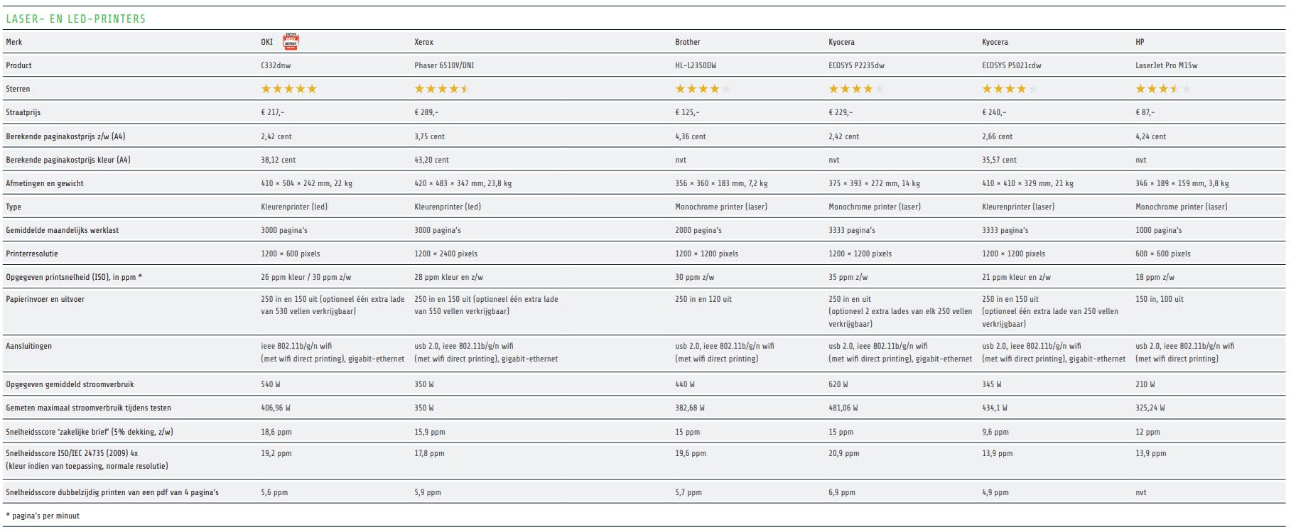 Daaruit blijkt dat de gemiddelde paginakostprijs van deze laserprinters niet wezenlijk verschilt van die van eerder geteste inkjetprinters uit het hogere marktsegment. Je kunt dus niet stellen dat één van beide printtechnieken ‘beter’ is dan de andere. Wel is het zo dat laser- en led-printers meer geschikt zijn om er grotere volumes mee te printen en dat ze dit gemiddeld sneller doen dan inkjetprinters.