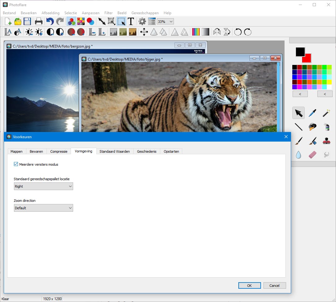 Op het tabblad Compressie kun je via een schuifknop de gewenste compressie instellen (van 0 tot 100), maar we raden je toch aan hier de optie Dialoogvenster altijd tonen te selecteren. Verder stel je bij Standaard Waarden de gewenste eenheid in, zoals pixels of centimeters. Bij Vormgeving kun je Meerdere vensters modus kiezen. Open je verschillende afbeeldingen tegelijk, dan komen die niet langer op een eigen tabblad terecht maar elk in een verplaatsbaar venster.