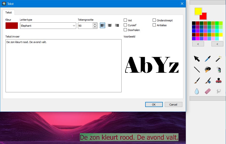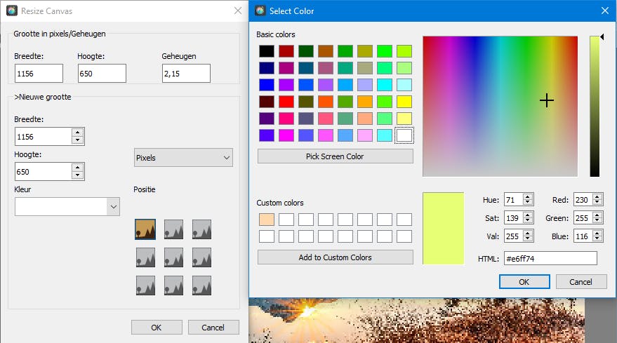 Met het muiswiel zoom je snel in en uit op het plaatje. Het is ook mogelijk de afmetingen aan te passen van zowel de foto als het canvas. Voor beide aanpassingen vind je knoppen in beeld, maar je kunt ook terecht in het menu Afbeelding.
