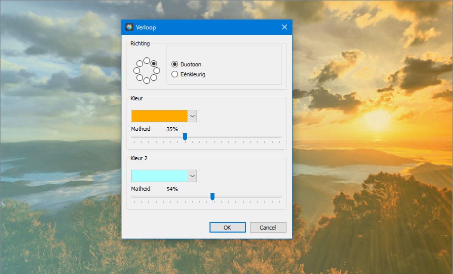 Met Helling leg je één (Eenkleurig) kleur of twee (Duotoon) kleuren vast die dan als een waas over je foto komen liggen. Je bepaalt zelf de richting van dit kleurverloop (bijvoorbeeld diagonaal of verticaal), net als de ondoorzichtigheid van de kleur(en).