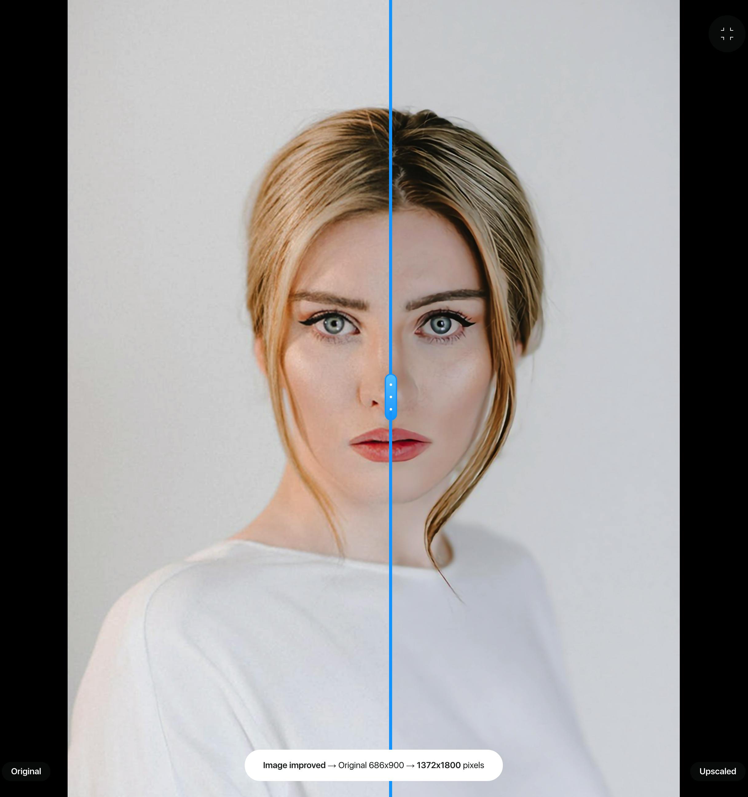 Afhankelijk van hoe groot het afbeeldingsbestand is, kan het even duren voordat het plaatje is geüpload en verwerkt. Daarna gebruikt Upscaler zijn AI-algoritme om de afbeelding twee keer groter te maken dan oorspronkelijk. In het voorbeeldvenster krijg je een verticale regelaar om de kwaliteit van voor en na met elkaar te vergelijken. Die truc met de voorvertoning is boerenbedrog, omdat er maar één goede manier is om de scherptekwaliteit van een foto te beoordelen. Dat is de foto vergroten tot 100% zodat één pixel van digitale afbeelding overeenkomt met één pixel van je computerscherm. Hiermee willen we niet beweren dat Upscaler geen goed werk doet, maar om het resultaat goed te beoordelen moet je de na-afbeelding dus vergroten.