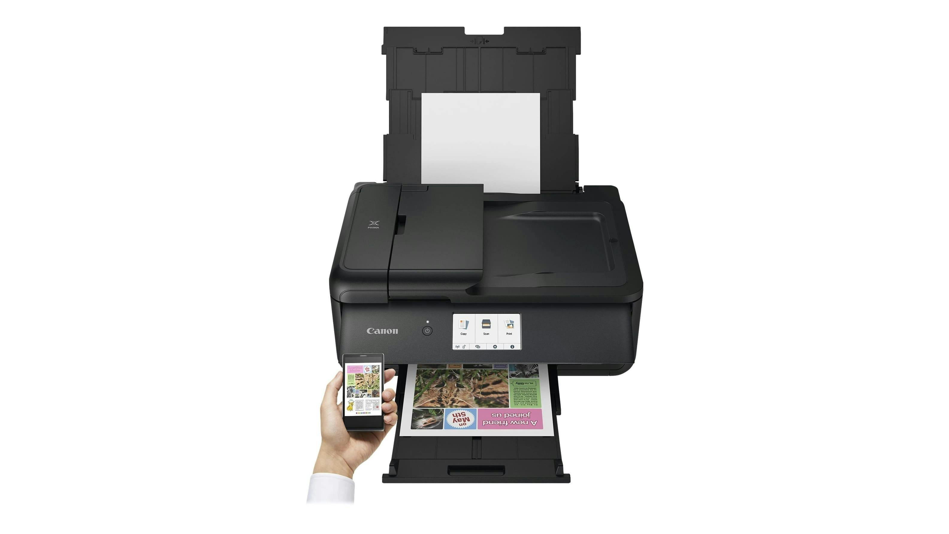 Het formaat van deze fraai ogende printer valt erg mee. Dankzij het kantelbare bedieningspaneel en de inklapbare papierlades steekt er bovendien niets uit, zodat je hem makkelijk in een kast kunt plaatsen. Het is een all-in-one-printer, waardoor je met dit apparaat ook kunt scannen en kopiëren. Een voordeel is dat de Canon PIXMA TS8350a met draadloze 2,4GHz- en 5GHz-netwerken kan communiceren; daarmee vergroot je de kans op een stabiele wifi-verbinding en kun je vanaf elk (mobiel) apparaat printtaken starten. Staan de fotobestanden op een geheugenkaart? Stop die dan in de printer en bepaal op het 4,3inch-display welke foto je wilt uitprinten. In deze printer gaan zes cartridges.
