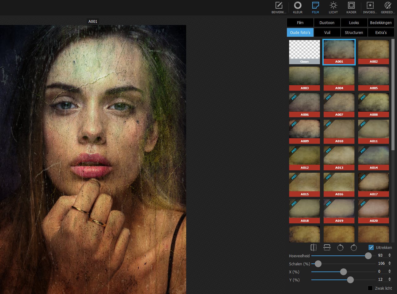 Over naar de knop Film, dat op zijn beurt acht rubrieken bevat. Stel, je wilt je foto’s een oude aanblik geven, zonder in dat eeuwige sepia te moeten vervallen. Dan heb je verschillende mogelijkheden, die je eventueel kunt combineren. Open de rubriek Oude foto’s en selecteer een van de vijf beschikbare effecten. Ook in de rubrieken Vuil en Extra’s vind je diverse effecten terug waarmee je je foto een wat verschenen of beschadigde aanblik geeft. Bij elk van deze effecten vind je onderaan een bedieningspaneel terug waarmee je het resultaat helemaal naar eigen hand zet.
