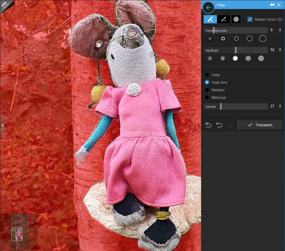 Je moet nu wel nog aangeven op welke fotodelen je die vervaging wilt toepassen. Daarvoor klik je op het penseel Toevoegen (+) en nadat je de hardheid, de vorm en de grootte van het penseel hebt ingesteld, kun je het vervagingsgebied op je foto uittekenen. Fout gemaakt? Met de knop Aftrekken (-) haal je het gewraakte deel weer weg. Zet een vinkje bij Masker tonen als je dit rode vervagingsmasker permanent in beeld wilt. Ziet alles er goed uit, bevestig dan met de knop Toepassen.