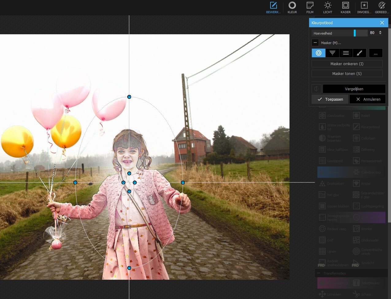 En daarmee zijn we er nog lang niet. Via de knop Kleur, bovenaan, opent zich namelijk een venster waarin je een dozijn of wat kleureffecten kunt instellen en nog zo’n hoeveelheid extra via het knopje Meer. Ook hier kun je telkens met de inmiddels bekende maskers zelf aangeven waar deze effecten zich precies mogen doorzetten.