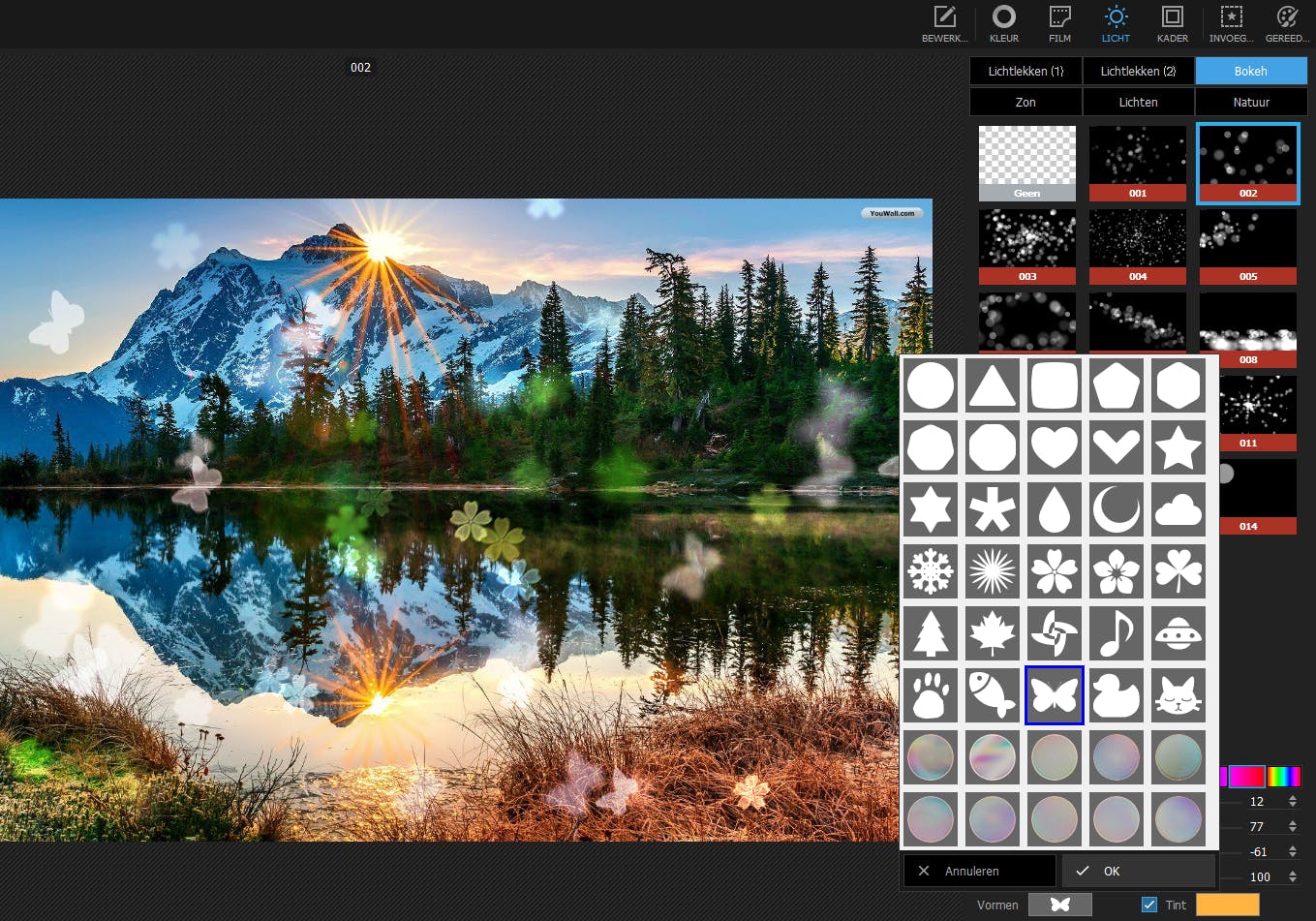 Beginnen we met bokeh. Druk daarvoor op de knop Licht en open de rubriek Bokeh. Helemaal onderaan druk je op de knop Vormen en selecteer je een geschikte vorm, waarna je met de muis boven de zestien beschikbare pictogrammen beweegt: het effect zie je telkens in je foto. Selecteer een geschikt bokehtype en pas onderaan zowel tinten, als Lichtheid, Schalen, Hoek en Verhouding naar wens aan.