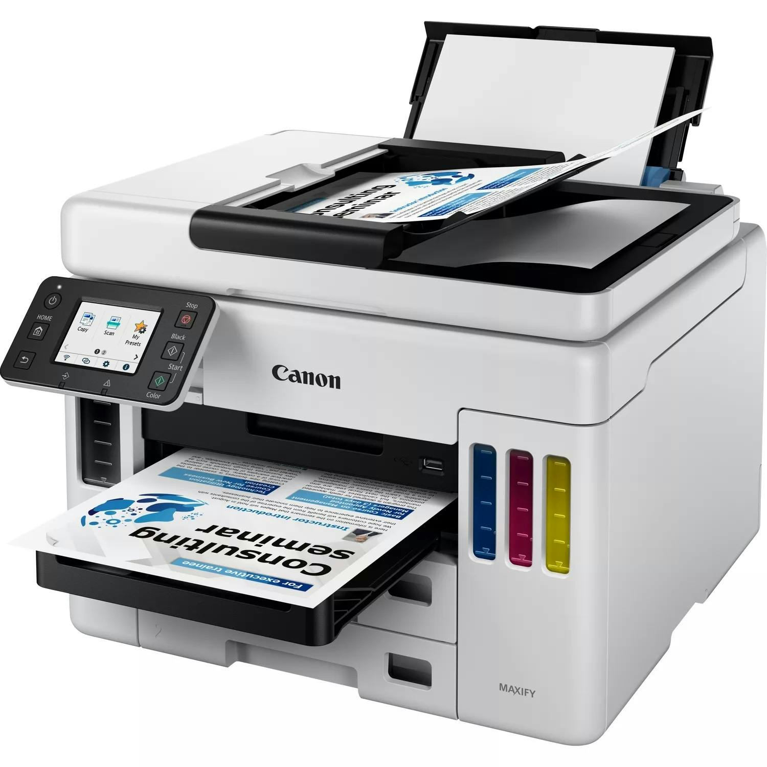Met de Maxify GX7050 richt Canon zich op zakelijke gebruikers. Het Japanse merk claimt dat een enkele flessenset goed is voor een opbrengst van maar liefst 14.000 kleurenpagina’s. In de zuinige modus zou er zelfs een capaciteit haalbaar zijn van 21.000 pagina’s in kleur. Het zwarte inktreservoir is overigens extra ruim, zodat je naar hartenlust documenten kunt afdrukken. Voor de bediening van deze printer kun je het aanraakscherm en de omringende fysieke knoppen gebruiken.
