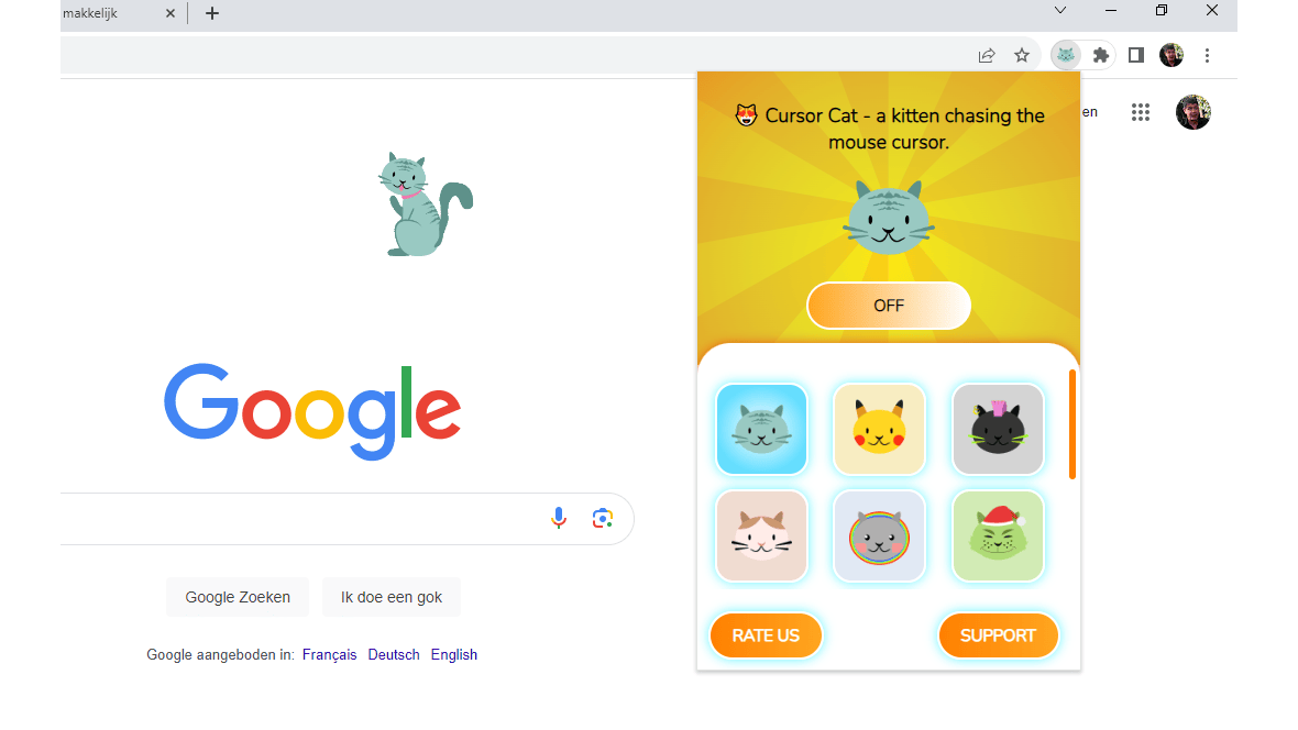 Maak een keuze uit een van de zes katten die achter je muisaanwijzer aangaan. Toch is Cursor Cat geen al te hinderlijke extensie, want meestal loopt de kat niet in de weg. Als je de cursor stil houdt, gaat de kat zelfs braaf zitten. Iets voor de kattenliefhebber dus!