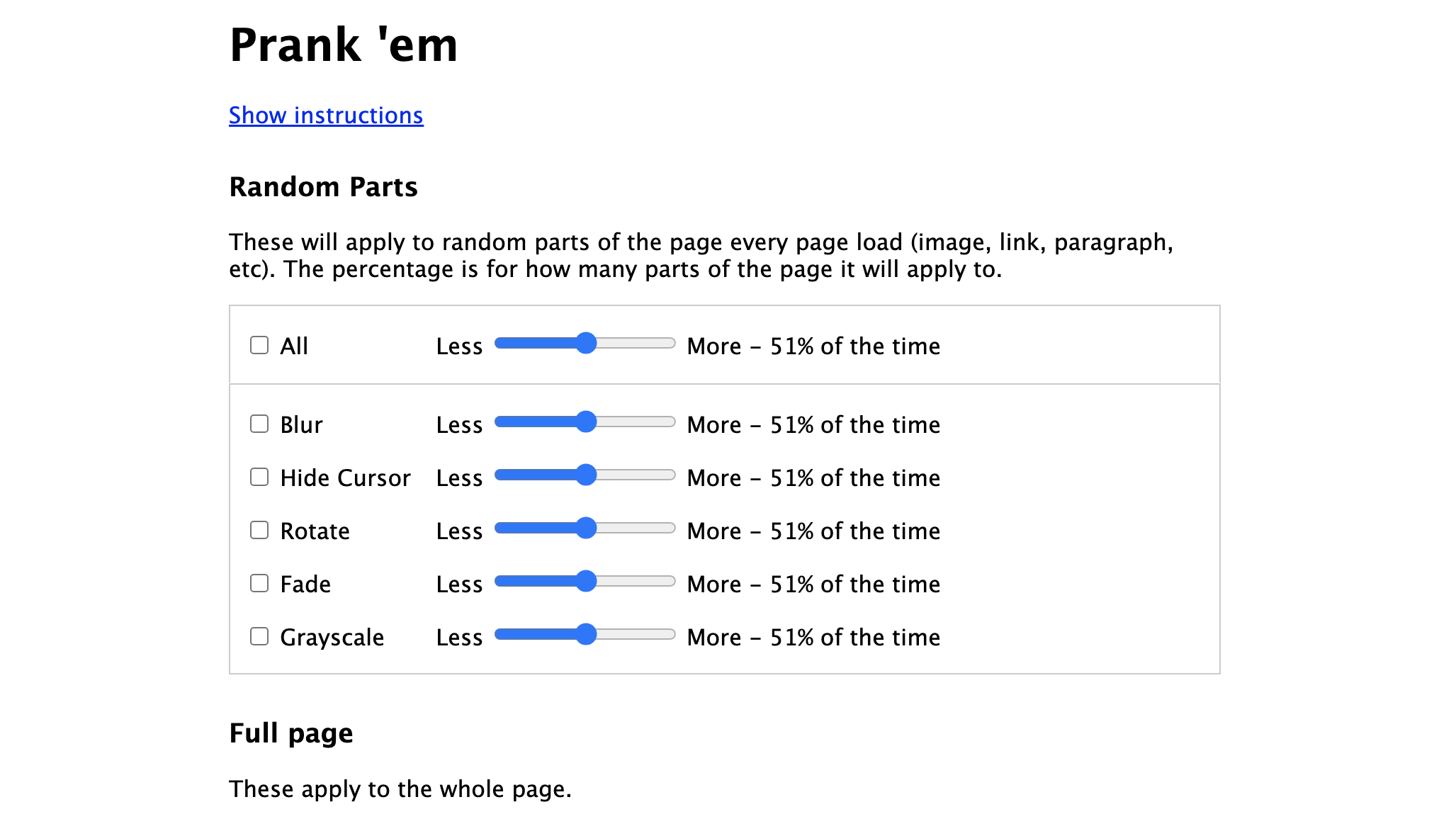 Met de Prank ‘em-extensie kun je vrienden en collega’s knettergek maken. De toevoeging bevat een breed scala aan tools om de weergave van Chrome te verstoren, zoals het scherm wazig maken, de cursor verbergen, het bureaublad roteren, naar grijswaarden omzetten … Prank ‘em pest op een even gemene als subtiele manier. Je kunt bijvoorbeeld instellen dat het effect op de volledige webpagina of een deel daarvan moet gebeuren. Bovendien bepaal je hoe regelmatig deze tool de boel moet verstoren. Als je de instelling Hide Cursor apply 10% kiest, dan zal je slachtoffer slechts een tiende van de tijd zijn muisaanwijzer kwijt zijn. Je moet natuurlijk wel de kans krijgen om de extensie op de computer van iemand te installeren.
