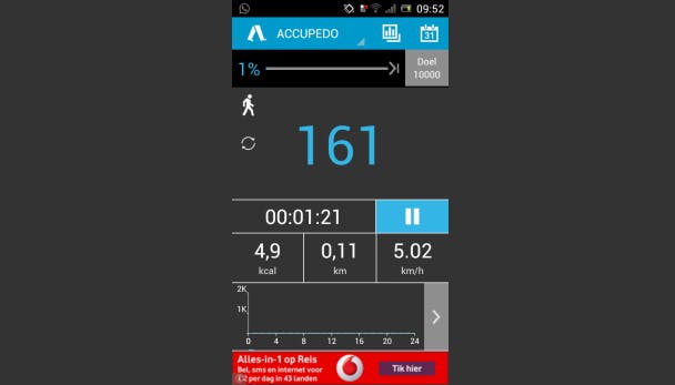 In de app geef je aan hoeveel centimeter er tussen je voorste en achterste been zit op het moment dat je een stap zet. Dat is meestal rond de 70 centimeter, maar met een meetlat kun je dat zelf eenvoudig opnemen. Met dit gegeven in combinatie met de gegevens van de versnellingsmeter die in je smartphone zit, bepaalt Accupedo wanneer een stap wordt gezet. Met het tempo wordt ook je loopsnelheid, het aantal verbruikte calorieën en de gelopen afstand berekend. Het doel van 10000 stappen blijft steeds in beeld, zodat je precies ziet hoeveel stappen je nog moet maken. Een grafiek geeft je voortgang per dag, week, maand en jaar weer.