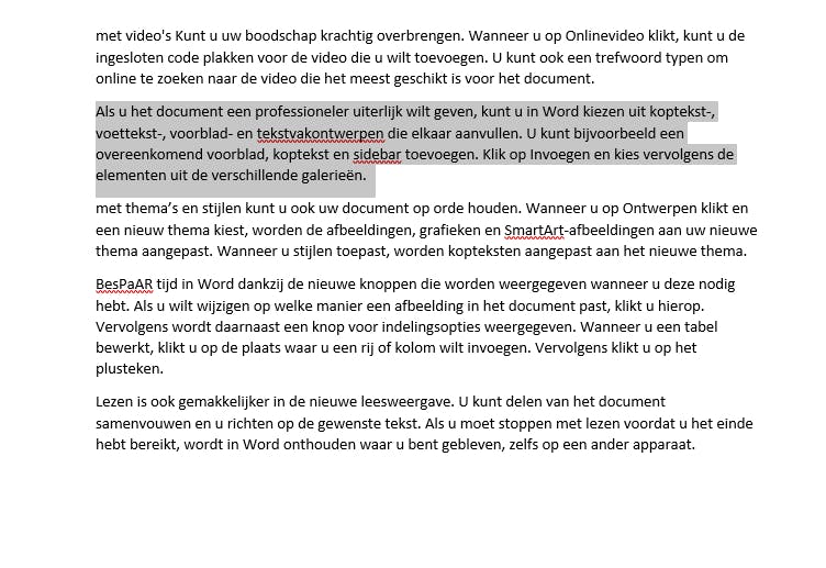 Bij het schrijven van een tekst heb je soms stukken die je nog niet in kunt vullen. Gegevens ontbreken, of je weet nog niet hoe je iets het beste kunt verwoorden. Het is dan handig om daar wel alvast de ruimte voor te reserveren door er ‘neptekst’ in te vullen. Maar iets willekeurigs verzinnen is nog zo eenvoudig niet. Ook hier kan Word je mee helpen. Opmakers gebruiken vaak een standaard Latijnse tekst (lorem ipsum) als tijdelijke tekst en Word bevat een generator van deze tekst. Om deze tekst in te voegen, typ je =lorem() en druk je op Enter. Er wordt nu automatisch een stuk tekst toegevoegd. Hoe lang die tekst is, kun je zelf bepalen door tussen de haakjes getallen in te vullen. Het eerste getal geeft het aantal alinea’s aan, het tweede getal het aantal zinnen per alinea. Voor een stuk tekst met vijf alinea’s en vier zinnen per alinea, typ je =lorem(5,4). Wil je liever een willekeurige Nederlandse tekst, typ dan =rand() waarbij dezelfde regels gelden voor alinea’s en zinnen.