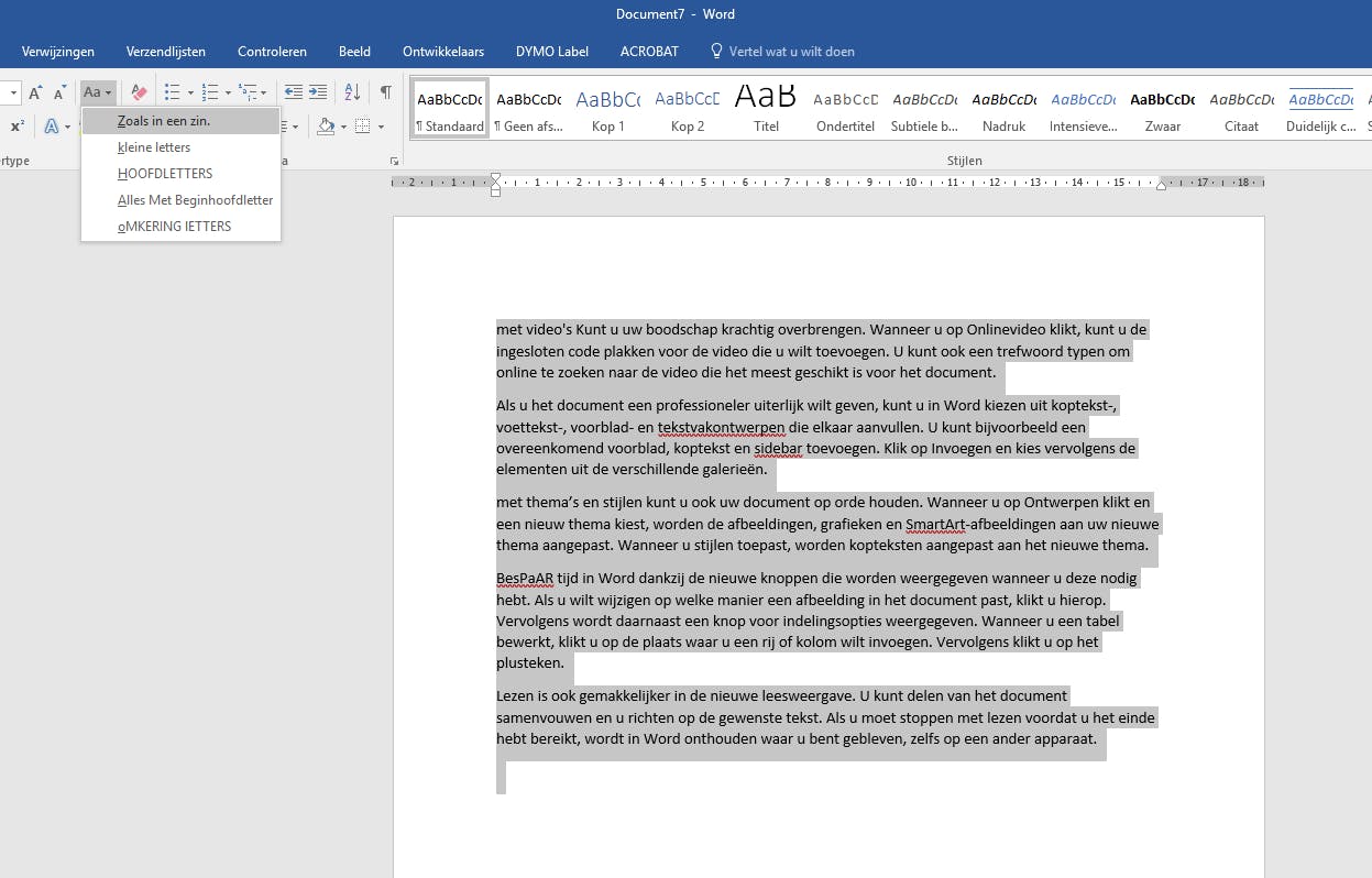 Een tekst begint in principe altijd met een hoofdletter en eindigt met een punt. Dat is tenminste hoe we het allemaal geleerd hebben. Helaas past niet iedereen dit in de praktijk altijd even goed toe, waardoor je af en toe documenten voor je neus krijgt die een compleet circus van hoofdletters en kleine letters zijn. Bij kleine bestanden kun je dat uiteraard eenvoudig corrigeren, maar als het gaat om honderden, wellicht duizenden zinnen, ben je daar uiteraard enorm veel tijd aan kwijt. Zonde! Word kan die klus namelijk in enkele seconden voor je klaren. Selecteer hiervoor de tekst, klik vervolgens op het tabblad Start, in het subvak Lettertype op het pictogram met de letters Aa. Je kunt nu precies aangeven hoe je wilt dat de zin wordt opgemaakt. Kies voor Zoals in een zin om de juiste taalregels toe te passen met een hoofdletter aan het begin van een zin en een punt aan het einde. Andere opties zijn bijvoorbeeld om de hele tekst om te zetten naar hoofdletters of kleine letters of ieder woord met een hoofdletter te laten beginnen, deze laatste drie opties kun je ook met Shift+F3 bereiken.