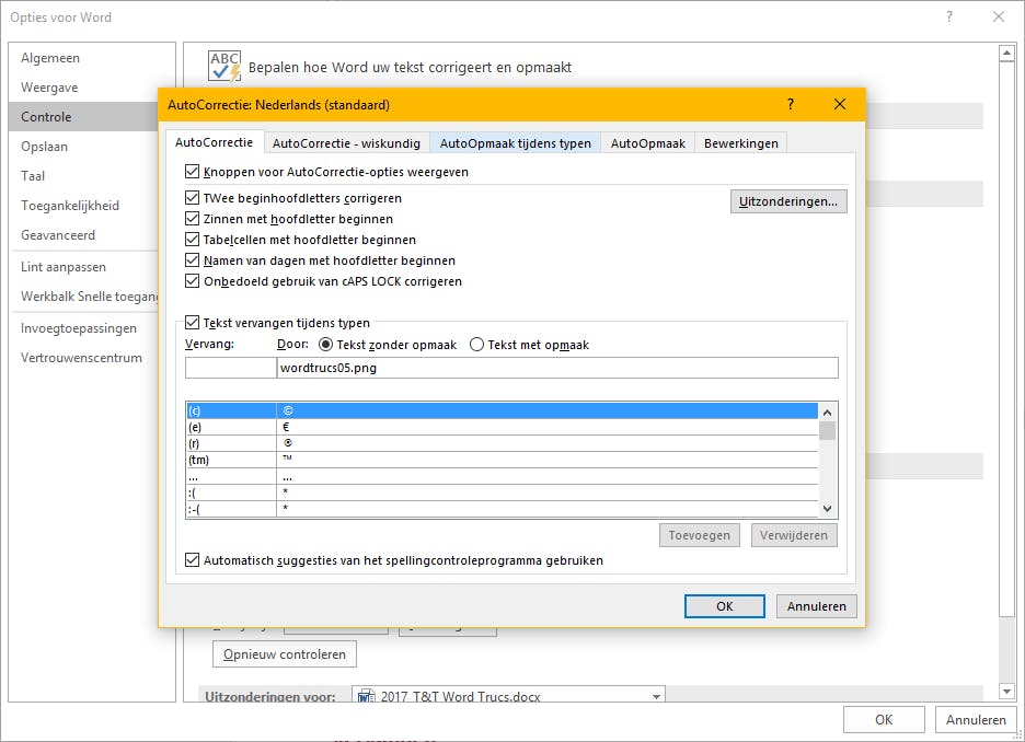 De meeste teksten die je in Word maakt, zullen meestal geen symbolen bevatten, op het euro- of dollarteken na. Wanneer je dan ineens wél symbolen moet invoegen, levert dat je geheid extra werk op. Neem bijvoorbeeld het trademark-teken: ™. Je kunt dit symbool, zoals alle andere symbolen, invoegen via Invoegen / Symbool, waarbij je het symbool op kunt zoeken in een van de lijsten. Echt snel is dit natuurlijk niet, en bovendien haalt het je uit de flow tijdens het schrijven. Een andere, iets snellere optie is door de letters TM te typen, de tekst te selecteren en de toetscombinatie Ctrl+Shift+= te gebruiken om de letters in superscript te zetten. Maar het kan nog sneller. De autocorrectie van Word is hierbij van grote dienst. Typ je in je tekst (tm), dan maakt Word er automatisch het trademark-symbool van, (c) verandert in het copyright-symbool en (r) geeft je het teken voor geregistreerd handelsmerk. Je kunt zelf nog veel meer codes toevoegen via Bestand / Opties / Controle / AutoCorrectie-opties.