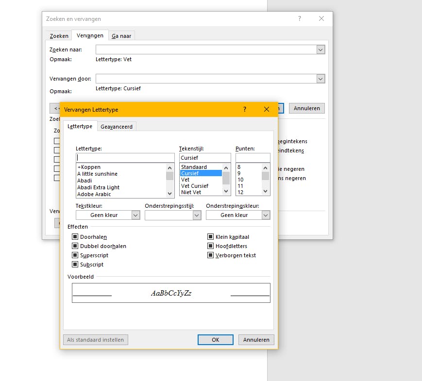 Zoeken en vervangen is een heel veelzijdige functie. Je hebt in tip 4 al gelezen dat je naast tekst ook afbeeldingen ermee kunt vervangen. Maar er is meer. Ook de opmaak van een tekst kun je er eenvoudig mee omzetten. Druk op Ctrl+H om het venster Zoeken en vervangen te openen. Normaliter zou je dus bij het veld Zoeken naar de tekst invullen die je wilt veranderen en bij het veld Vervangen door de tekst waarvoor je het wilt vervangen. Maar nu klik je onderin eerst eventueel op Meer > > en daarna weer onderin op Opmaak. Je krijgt een lijst met opmaakelementen te zien. Ter illustratie klikken we op Lettertype. Je kunt hier bijvoorbeeld voor een lettertype kiezen dat je in z’n totaliteit wilt vervangen, maar ook voor een tekenstijl, zoals Vet. Vervolgens druk je op OK. Daarna klik je in het veld Vervangen door, klik je wederom op Opmaak en kies je bijvoorbeeld voor Cursief. Nu vervang je alles wat vet is door cursief. Of, wanneer je ook een woord bij Zoeken naar invult, alle vetgedrukte instanties van dat woord cursief maken. Dit kan je enorm veel tijd schelen.