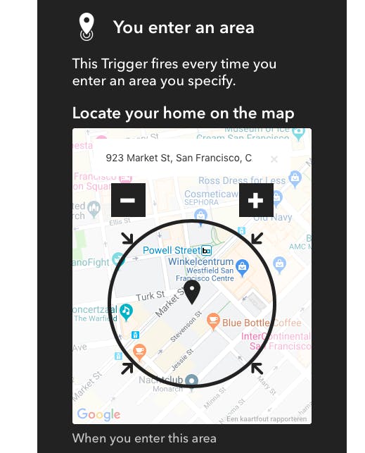 Dit recept voor Flux Smart Lights zorgt ervoor dat je lampen aangaan wanneer je thuis komt. Hiervoor heb je wel de IFTTT-app nodig voor Android of iOS, en moet je de locatie-service aanzetten van je smartphone. In het recept kun je een zogenaamd ‘geofence’ aanzetten, oftewel een ring rond je huis waarbinnen de actie wordt gestart. Je mobiel moet dan uiteraard ook wel een dataverbinding hebben, want als je mobiele internet uitstaat kan het recept ook niet activeren. Maar als je aan deze voorwaarden voldoet, dan staan je lampen dus aan als je het huis binnenstapt.