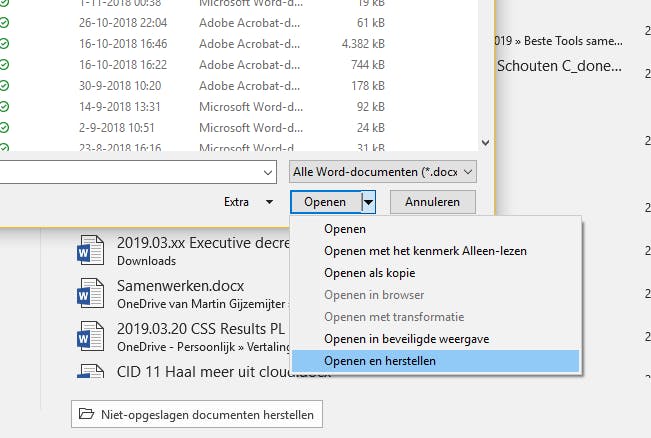 Het is de nachtmerrie van iedereen die veel werk steekt in z’n Word-documenten. Heb je keihard gewerkt aan een compleet boekwerk, en vlak voordat je het wilt gebruiken of versturen, kun je het document ineens niet meer openen. Een magische oplossing is her helaas niet voor, soms zijn bestanden echt onherstelbaar beschadigd. Maar voordat je direct deze conclusie trekt, kun je nog twee dingen proberen. Start Word, klik op Bestand / Openen en zoek naar het bestand dat je wilt openen. Klik vervolgens op Bladeren en kies in het uitklapmenu van de knop Openen voor Openen en herstellen. Word zal dan proberen om het document te herstellen. Een andere optie (die Microsoft suggereert) is het document in te voegen in een ander document. Klik hiervoor in het lint op het tabblad Invoegen en vervolgens op Object invoegen. Kies het juiste bestandstype en blader naar het gewenste document. Werkt het? Sla dit document dan op als een nieuw document, waarmee je het probleem oplost. Kleine tip: als je in de cloud werkt, kun je altijd terug naar vorige versies van het document. Hierdoor heb je altijd wel een werkende versie tot je beschikking (zij het dat je dan wel het een en ander kwijt bent).