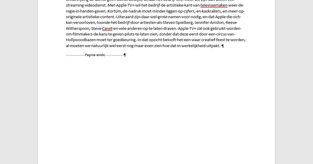 Iedereen die met Word werkt, kan beamen dat het soms wel lijkt alsof het programma een eigen wil heeft. Tekst verspringt of staat ineens in kolommen of een pagina eindigt ineens halverwege. Hoe vreemd dit soort problemen soms ook lijken, we kunnen je garanderen dat het nóóit Word is die besloten heeft om er zelf een feestje van te maken. Er zit een logische reden achter: om te bepalen wat voor opmaak er in een document gebruikt moet worden, gebruikt Word speciale tekens, die de toepasselijke naam Verborgen opmaaksymbolen dragen. Zo is een pagina-einde één van die symbolen. Wanneer je problemen ervaart met een pagina die op een gekke plek eindigt (of tekst die plotseling in kolommen staat), kun je het beste op het pictogram klikken voor de genoemde verborgen opmaaksymbolen (het lijkt wat op een muzieknoot en je vindt hem in het lint, tabblad Start, boven het kopje Alinea. Als je deze weergave aanzet, zie je dat alles, van spaties tot regeleindes, wordt geregeld met behulp van zo’n symbool. Pagina-einde is ook zo’n symbool. Verwijder je dit symbool, dan verwijder je ook het pagina-einde. Op die manier kun je ‘rommel’ uit je document halen.