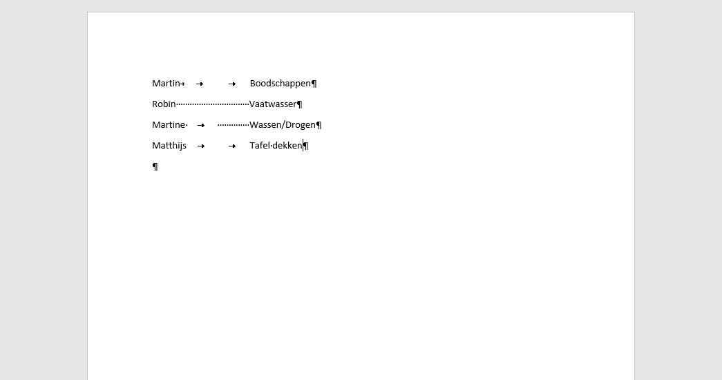 Twee kolommen met tekst kun je gemakkelijk scheiden door middel van spaties, maar verstandig is dat niet, want de ruimte is daardoor niet consistent en die kleine verschillen maken het document heel slordig. Bovendien heeft Word de neiging om ‘slim’ op te treden en een aantal van deze spaties om te zetten in een tab (de functie die bedoeld is voor witruimte). Als de ene reeks spaties wel wordt omgezet, en de andere niet, kloppen je witruimtes helemaal niet meer en lijkt het wederom alsof het document een eigen wil heeft terwijl Word slechts probeert je ‘fouten’ te herstellen. De oplossing? Spaties alleen gebruiken waarvoor ze bedoeld zijn, om ruimte te creëren tussen twee woorden. Wil je kolommen creëren, typ dan eerst het woord en druk daarna net zo lang op de tabtoets tot je de gewenste ruimte hebt. Heb je zo’n document met spaties en tabs door elkaar, schakel dan de functie Verborgen symbolen in om met eigen ogen te zien waarom Word er geen kaas van kan maken.