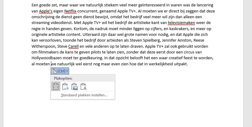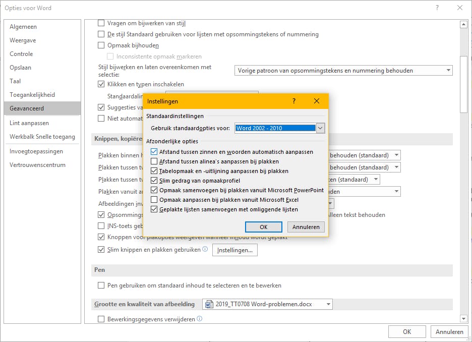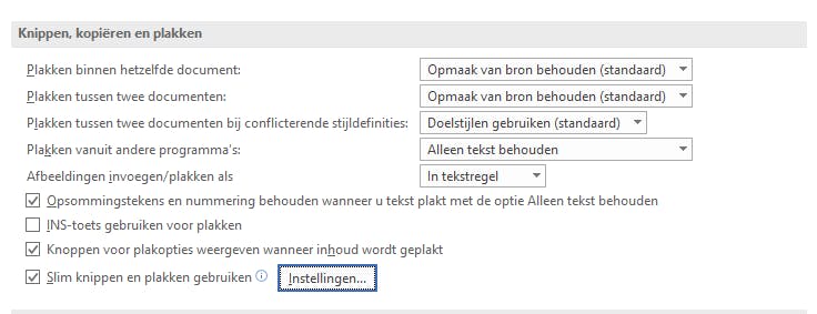 De mogelijkheid om tekst te kopiëren/knippen en plakken in Word heeft ons werkproces door de jaren heen een stuk efficiënter gemaakt. Toch gaat er met dit plakken voor je gevoel ook weleens iets mis, bijvoorbeeld wanneer je een woord midden in een bestaande tekst wilt plakken. Er verschijnt dan plotseling een spatie voor én na het geplakte woord, terwijl je die spatie niet mee gekopieerd hebt uit de brontekst. Word gaat er echter van uit dat je voor en na tekst die je plakt altijd een spatie wil hebben (wat niet onlogisch is) en voegt deze gemakshalve alvast voor je toe. Heb je daar geen behoefte aan, dan kun je dit uitschakelen door te klikken op Bestand / Opties / Geavanceerd. Scrol dan naar het kopje Knippen, kopiëren en plakken. Klik nu op de knop Instellingen naast Slim kopiëren en plakken gebruiken. In dat menu kun je de spaties uitschakelen, plus nog wat andere handigheidjes die Word automatisch toepast.