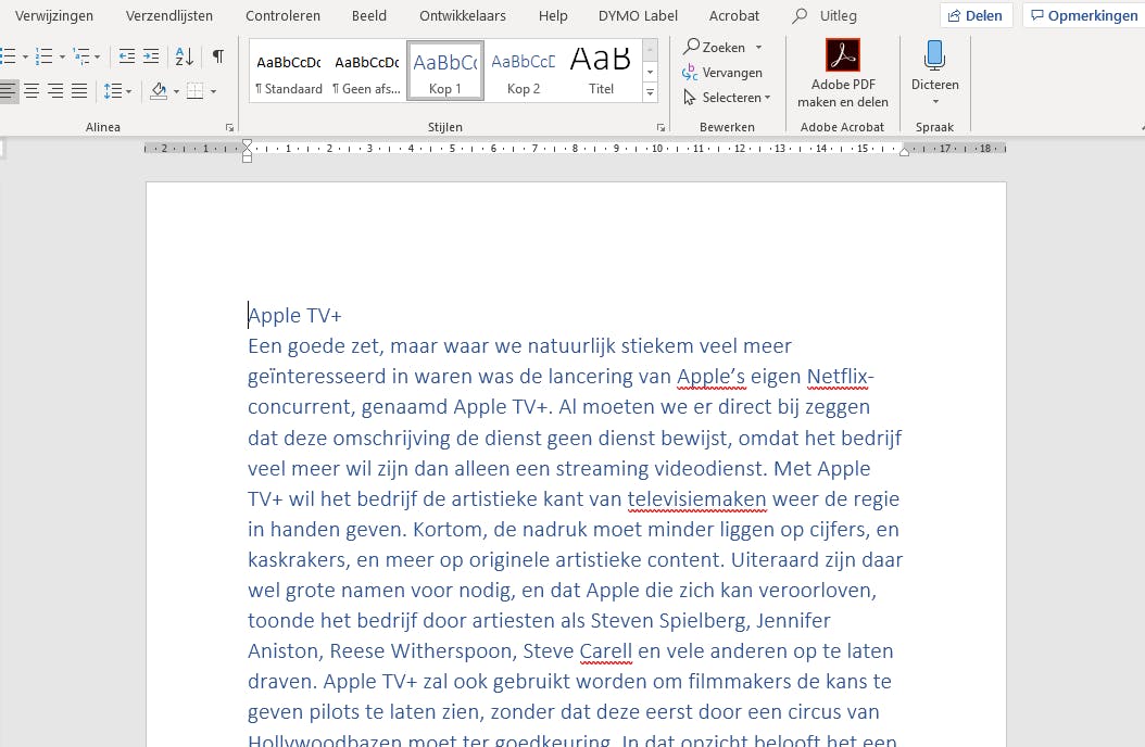 Je hebt een tekst getypt beginnend met een kop en daaronder de tekst. Vervolgens wil je een stijl toepassen op die teksten, waarbij de kop logischerwijs anders opgemaakt wordt dan de tekst eronder. Maar zo gauw je een stijl aan je kop toevoegt, neemt ie direct de tekst daaronder mee, en dat was natuurlijk niet de bedoeling. Dat zoiets gebeurt, ligt aan het gebruik van de Enter. Er bestaan zowel harde als zachte enters. Is er een zachte enter gebruikt, wat je doet door Shift ingedrukt te houden terwijl je op Enter drukt, dan ziet Word dat als één alinea, en krijgt alles dezelfde opmaak. De oplossing is heel eenvoudig: wil je aan de slag met de opmaakstijlen, maak dan gebruik van harde enters (door alleen maar de Enter-toets in te drukken).
