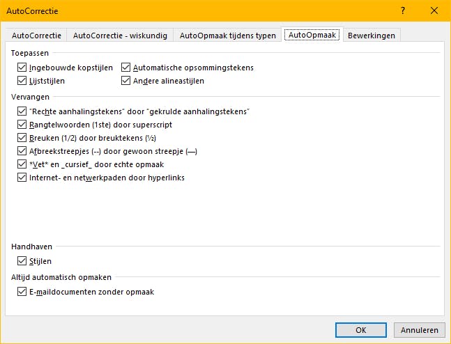 Zoals je in dit artikel hebt kunnen lezen, worden veel ‘problemen’ in Word veroorzaakt door de poging van Microsoft om het programma slimmer te maken. Omdat iedereen zijn eigen manier van werken heeft, zorgt dat soms voor conflicten. Heb je daar vaak last van, dan kun je op een andere manier leren werken, en op de lange termijn heeft dat was ons betreft de voorkeur. Maar heb je geen tijd voor of zin in, weet dan dat je dat slimme gedrag van Word ook kunt uitschakelen. Klik daarvoor op Bestand / Opties / Controle / AutoCorrectie-opties. Klik nu op het tabblad AutoOpmaak om alle opties te zien die Word automatisch voor je aanpast. Schakel de vinkjes uit voor de opties die je liever zelf in de hand hebt.