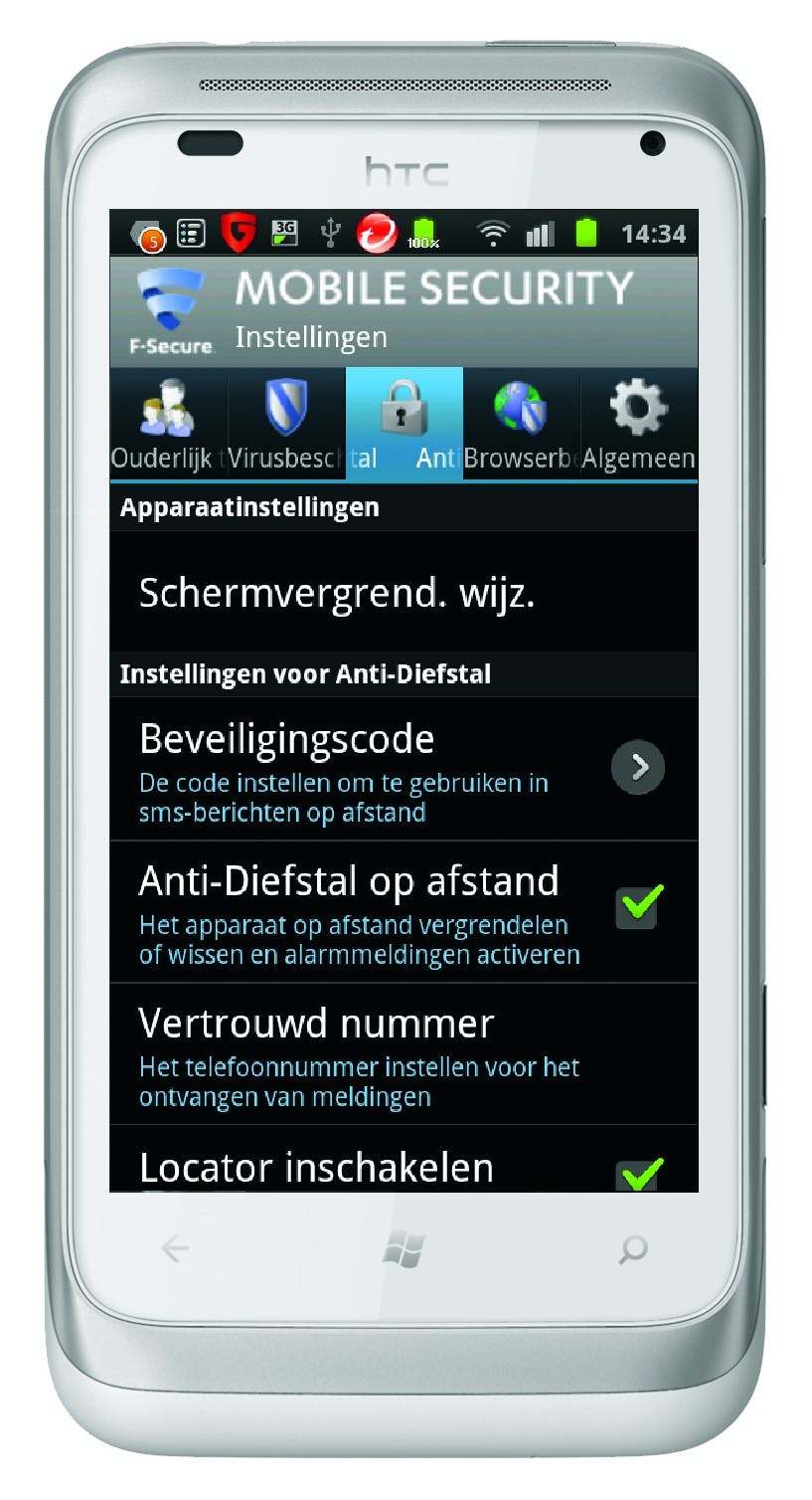 De oplossing van F-Secure vindt u opvallend genoeg niet in Android Market, maar is wel voor dit platform beschikbaar, en ook voor Symbian en Windows Mobile 6. Via f-secure.mobi kunt u een gratis probeerversie aanvragen. De bediening is niet zo intuïtief, maar compleet is het zeker, al is het jammer dat antidiefstalfuncties (traceren, blokkeren of wissen op afstand) ook hier alleen via opdrachten per sms werken, niet via een browser. U ontvangt ook een melding zodra de simkaart wordt gewisseld. Opvallend aan de blokkeerfunctie is dat u verplicht wordt een vergrendelpatroon of pincode in te stellen op uw Android-telefoon. In feite wordt het toestel namelijk ‘standaard’ vergrendeld, zoals dat ook gebeurt als u het korte tijd niet gebruikt. Daardoor wordt u regelmatig met deze beveiliging geconfronteerd. De wisfunctie gaat grondig te werk: het toestel gaat terug naar fabrieksinstellingen en ook de geheugenkaart wordt gewist. Verder biedt het uiteraard antivirus, een losse veilige browser (de standaard-browser blijft onbeschermd) en Ouderlijk toezicht voor het blokkeren van ongewenste websites (zoals porno, chat of dating).