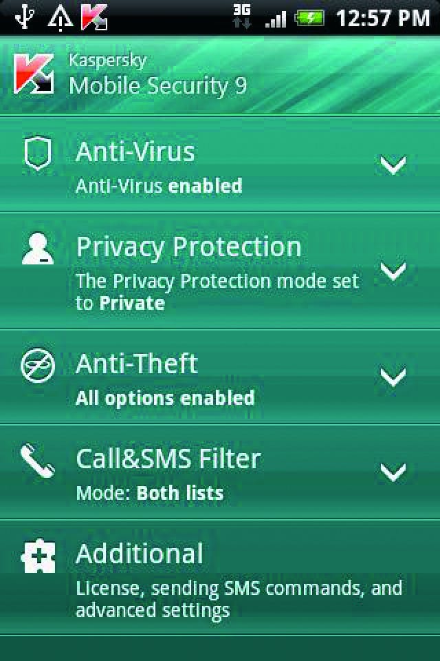 Voor het blokkeren of wissen op afstand moet u een sms-bericht naar uw toestel sturen. U kunt ook een bericht instellen dat op het scherm verschijnt zodra de smartphone wordt geblokkeerd. Bijvoorbeeld met uw adres, zodat een eerlijke vinder het terug kan sturen. Het traceren, blokkeren en wissen op afstand gaat helaas alleen per sms en niet via een browser. Om het te traceren, ontvangt u een sms met link naar Google Maps. Natuurlijk wordt het wisselen van de simkaart ook gedetecteerd. Gebeurt dat, dan ontvangt u een e-mailbericht met het nieuwe telefoonnummer. Verder bevat het een bel- en sms-filter met whitelist en blacklist en privacybescherming, wat vooral inhoudt dat u bepaalde contacten en telefoonnummers privé kunt houden door sms’jes en oproepen van die personen onzichtbaar te maken. Opvallend is dat Kaspersky de app op haar eigen site voor 24,95 euro aanprijst met licentie voor één jaar, terwijl de app in Android Market maar 6,95 euro kost met onbeperkte licentie.
