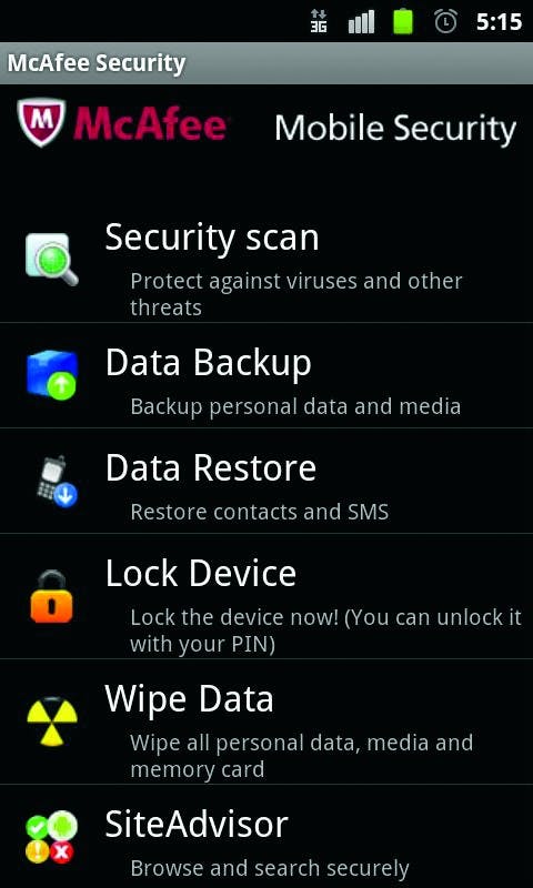 McAfee Mobile Security, beschikbaar als gratis proefversie (zeven dagen), combineert in feite VirusScan Mobile voor antivirus, WaveSecure (ook apart beschikbaar) voor antidiefstalfuncties en SiteAdvisor voor browserbeveiliging bij gebruik van de standaard Android-browser. Na eenmalige registratie per sms kunt u een zescijferige pincode instellen en tot negen vrienden toevoegen die een sms-bericht ontvangen als er een andere simkaart in uw telefoon wordt gestopt. Met uw nummer en pincode kunt u via de browser inloggen om uw telefoon te traceren, vergrendelen en wissen, al kunt u opdrachten ook per sms geven. Bij wissen via de browser kunt u zelf kiezen wat u wilt wissen (contacten, sms, foto’s, video’s, geheugenkaart en oproeplogboeken). U kunt, ook achteraf via de browser, een backup maken van contacten, sms-berichten, oproeplogboeken en media. Dat geeft u ook de kans te zien wat een dief zoal heeft uitgespookt.