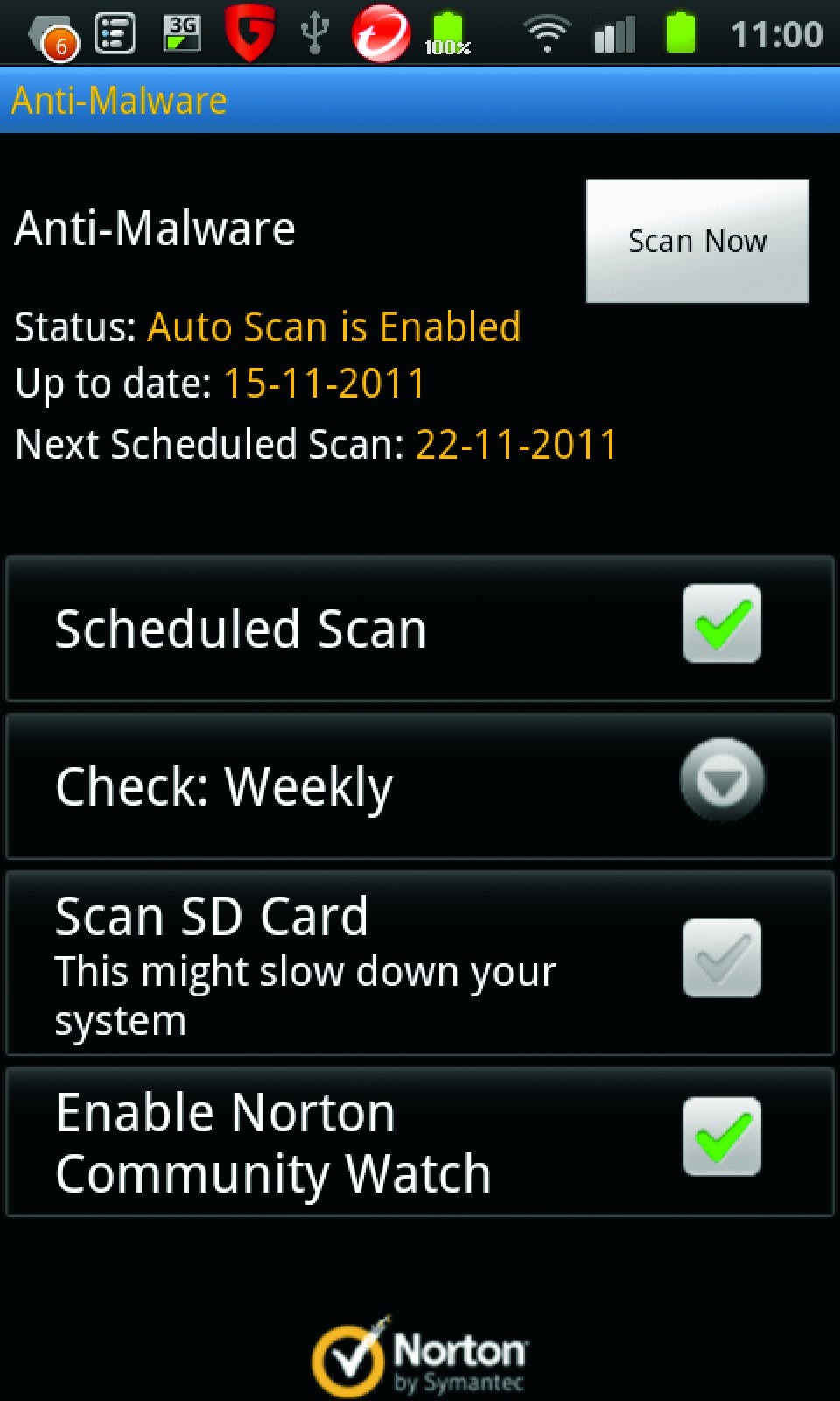 Norton volgt, met haar Lite-pakket, inmiddels de lijn van Lookout: gratis antivirus met gratis updates van definities en tegen betaling diverse extra’s. Het scannen op virussen gaat razendsnel en is binnen enkele seconden klaar. U kunt dit automatisch dagelijks, wekelijks of maandelijks laten plaatsvinden. Optioneel scant u de geheugenkaart, al vraagt dat meer tijd en is het niet strikt nodig, omdat malware op de geheugenkaart geen schade kan aanrichten. Het gebruik van antidiefstalfuncties per sms is gratis. Er is wel een abonnement nodig om deze functies ook via een browser te kunnen gebruiken. Naast het blokkeren, traceren of wissen kunt u via de browser ook een foto van de camera opvragen. Wellicht nuttig om een dief te identificeren. De volledige versie biedt nog twee extra’s: een bel- en sms-filter en bescherming tegen onveilige websites. Helaas moet u wel flink betalen voor de volledige versie.