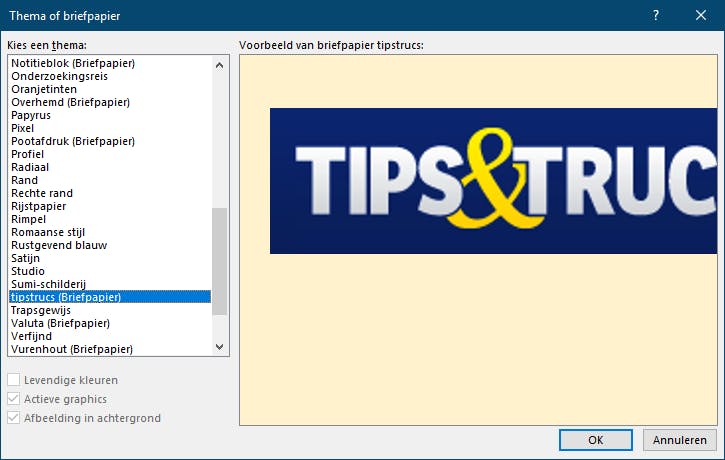 Maak je liever je eigen briefpapier? Start dan een nieuw bericht en voeg een of meer afbeeldingen toe. Klik zo’n plaatje met de rechtermuisknop aan en kies Tekstterugloop / Achter tekst als je dat naar achteren wilt verplaatsen. Een achtergrond toevoegen doe je via het tabblad Opties waar je Paginakleur / Opvuleffecten selecteert en op het tabblad Afbeelding de optie Afbeelding selecteren aanklikt.