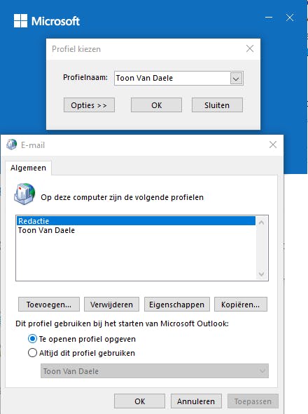 Melden verschillende gezinsleden zich met hetzelfde Windows-account op een pc aan, dan kan het handig zijn wanneer elk gezinslid toch alleen de mailmappen van zijn/haar eigen account in Outlook te zien krijgt. Om dat voor elkaar te krijgen, zorg je dat ieder gezinslid een eigen mail-gebruikersprofiel heeft. Druk op de Windows-toets, tik configuratie in en start Configuratiescherm op. Bij Weergeven selecteer je het best even Grote pictogrammen. Vervolgens klik je E-mail of Mail (Microsoft Outlook 2016) aan. Het venster E-mailconfiguratie duikt op, waar je de knop Profielen weergeven indrukt. Op het tabblad Algemeen druk je de knop Toevoegen aan en vul je de instellingen van het beoogde e-mailaccount in. Bij Dit profiel gebruiken bij het starten van Microsoft Outlook kies je dan voor Te openen profiel opgeven. Bevestig met OK. Als je nu Outlook opstart, zal telkens worden gevraagd met welk profiel je het mailprogramma wilt openen.