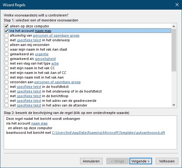 Sluit het bericht af, open het tabblad Start en kies Regels / Regels en waarschuwingen beheren. Klik hier op Nieuwe regel en selecteer onderin bij Beginnen met een lege regel het item Regel toepassen op berichten die ik ontvang. Druk op Volgende en plaats een vinkje bij via het account naam map. Klik daarna in het onderste paneel op naam map en selecteer het gewenste account. Bevestig met OK. Druk weer op Volgende en plaats een vinkje bij beantwoord het bericht met een specifieke sjabloon. Klik in het onderste paneel dan op een specifieke sjabloon. Er duikt een nieuw venster op waar je bij Zoeken in de optie Gebruikerssjablonen in bestandssysteem selecteert en naar het bewaarde oft-bestand verwijst. Bevestig met Openen en met Volgende (2x). Geef je regel een geschikte naam en rond af met Voltooien. Een nadeel is dat Outlook wel actief moet zijn om het automatische antwoord door te kunnen sturen zodra je een bericht ontvangt.