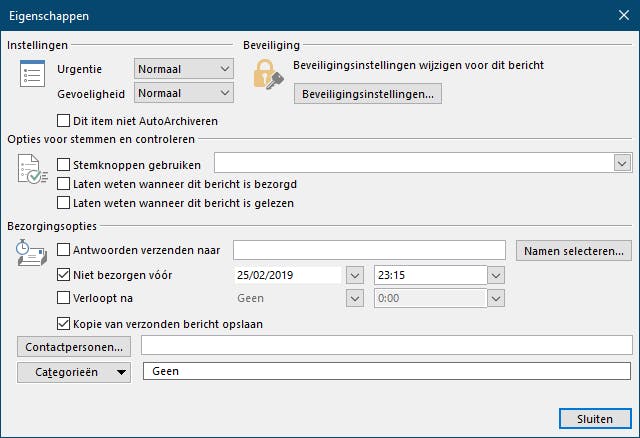 Je wilt iemand een mail sturen, maar daar nog wel eventjes mee wachten (bijvoorbeeld tot je de tijd dat je weet dat die persoon ongeveer thuiskomt). Je kunt Outlook dan duidelijk maken dat je een bericht pas later wilt versturen. Stel alvast het bericht op, maar verzend het nog niet. In plaats daarvan open je het tabblad Opties en kies je in de rubriek Meer opties voor Bezorgen uitstellen. In het venster dat nu verschijnt, kun je bij het onderdeel Bezorgingsopties nauwkeurig aangeven wanneer je het bericht wilt laten versturen, bijvoorbeeld Niet bezorgen vóór 25/03/2019, 23.15 uur. Plaats ook even een vinkje bij Kopie van verzonden bericht opslaan; dat geef je naderhand wat meer zekerheid dat de verzending (goed) is uitgevoerd. Bevestig met Sluiten en klik dan pas op Verzenden in je e-mail. Het bericht blijft hangen in je Postvak UIT tot het grote moment is aangebroken. Moet nog wel even gezegd: je pc én Outlook moeten hiervoor dan natuurlijk wel actief zijn.