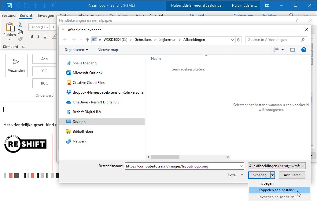 Wil je in je handtekening een plaatje dat automatisch verandert als jij het bijbehorende plaatje wijzigt? Dat kan. Je moet dan zorgen dat de afbeelding ergens online bereikbaar is. In plaats van het plaatje zelf in de handtekening op te nemen, neem je een koppeling naar de afbeelding op. Dat doe je op bijna dezelfde manier als beschreven in tip 2. Bij het kiezen van de afbeelding blader je nu echter niet naar een locatie op je computer, maar je vult de url naar die afbeelding in, inclusief http(s)://, bijvoorbeeld: http://www.mijnsite.nl/mijnplaatje.jpg. Klik niet op Invoegen maar op het pijltje direct naast deze knop, waar je dan Koppelen aan bestand selecteert. Je zult zien: wijzig je het plaatje online, dan krijgen de ontvangers bij het (opnieuw) openen van het bericht het aangepaste plaatje te zien. Gezien het om externe inhoud gaat zullen ze wel eerst op Klik hier om afbeeldingen te downloaden / Afbeeldingen downloaden moeten klikken voordat ze de afbeelding zien.