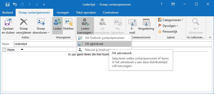Mail je geregeld naar dezelfde groep mensen, dan is het handig als je een distributielijst samenstelt: je hoeft dan alleen de naam van deze groep in het Aan- of (b)cc-veld in te tikken om gelijk iedereen te mailen. Ga naar Start en kies Nieuwe items / Meer items / Groep contactpersonen. Er opent een nieuw venster waar je op de knop Leden toevoegen drukt. Vervolgens geef je aan hoe je leden wilt toevoegen: Uit Outlook-contactpersonen, Uit adresboek of wil je een Nieuwe e-mailcontactpersonen aanmaken?