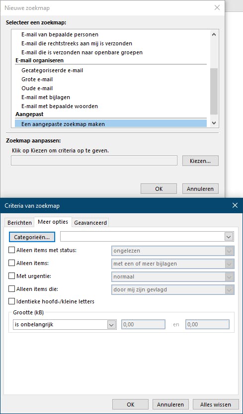 Scrol in het mappenvenster naar onderen tot je Zoekmappen tegenkomt. Rechtsklik erop en klik op Nieuwe zoekmap. Er verschijnt een venster met een aantal vooraf gedefinieerde zoekcriteria, zoals E-mail va bepaalde personen en E-mail met bijlagen. Helemaal onderaan kun je ook je eigen criteria bepalen: klik onder Aangepast op Een aangepaste zoekmap maken en daarna op Kiezen. In het nieuwe venster kun je via Voorwaarden uit tal van – al dan niet gecombineerde – criteria kiezen. Bevestig met OK en geef via de knop Bladeren aan welke mailmappen moeten worden doorzocht. Zorg dat je je zoekmap een herkenbare naam geeft en rond af met OK (2x). Als het goed is duiken even later alle overeenkomstige mails in je zoekmap op, zowel reeds ontvangen berichten als nieuwe e-mails.