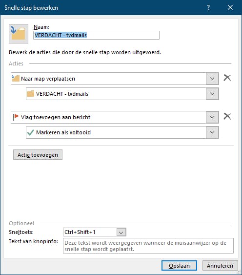 Of wat dacht je van de functie Snelle stappen, die je kan helpen wanneer je bijvoorbeeld vaak e-mails doorstuurt naar een kennis of collega. Open het tabblad Start en klik het pijltje aan bij Snelle Stappen. Druk op de knop Nieuw en kies uit een van de voorkeuzes of selecteer Aangepast. In het uitklapmenu bij Kies een actie kies je vervolgens een of meer stappen uit die je bij het selecteren van je ‘snelle stap’ wilt laten uitvoeren. Eventueel koppel je hier nog een Sneltoets aan. Bevestig met Voltooien en met OK. Test je snelle stap uit.