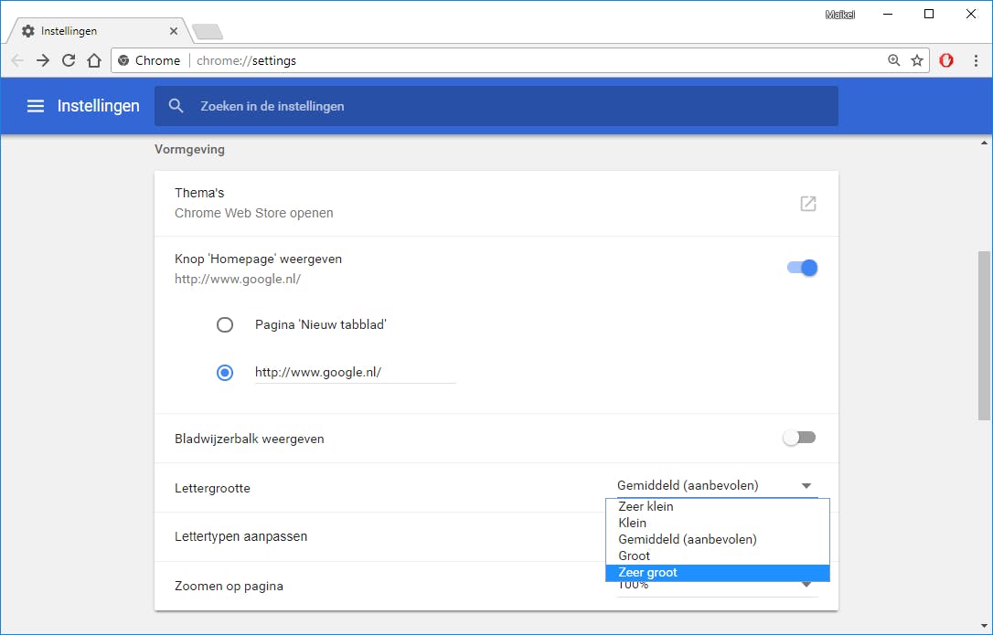 Ben je ietwat slechtziend en wil je de lettergrootte aanpassen, ga dan naar Google Chrome aanpassen en beheren / Instellingen en zoek daar naar het onderdeel Lettergrootte. Standaard staat deze instelling op Gemiddeld, maar je kunt ook kiezen voor Groot of Zeer groot. Het is de bedoeling dat alleen de lettergrootte van de webpagina wijzigt. Helaas werkt deze optie lang niet voor iedere website. Wat wel altijd werkt, is het zoomniveau aanpassen. Naast de tekst vergroot je daarmee ook afbeeldingen en video’s. Stel bij Zoomen op pagina een hoger percentage in om de volledige webpagina te vergroten.