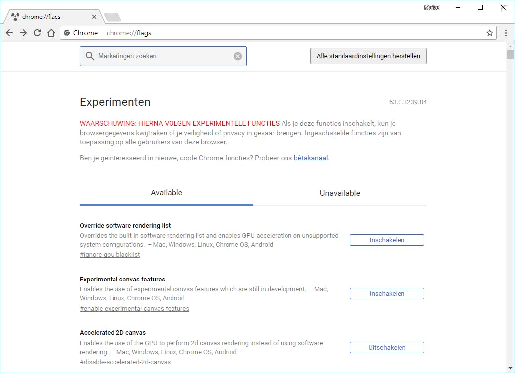 Chrome bevat allerlei experimentele functies die je op eigen risico kunt gebruiken. Typ in de adresbalk maar eens chrome://flags en druk op Enter. Bovenaan staat een waarschuwing dat je bij gebruik van experimentele functies mogelijk gegevens kwijtraakt of je privacy in gevaar brengt. Je hebt toegang tot honderden functies. Klik op Inschakelen wanneer je iets op eigen risico wilt uitproberen. Heb je in veel instellingen gerommeld, klik dan bovenaan op Alle standaardinstellingen herstellen en Nu opnieuw opstarten. Chrome werkt dan weer als vanouds. Overigens kun je ook de bètaversie van Chrome installeren wanneer je graag toegang hebt tot de nieuwste functies.