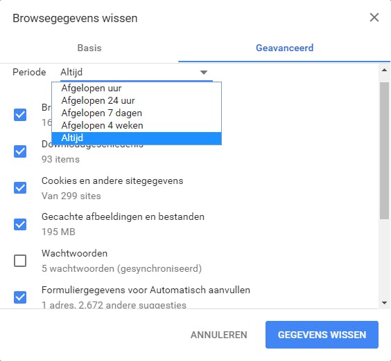 Zoals we eerder al vertelden, verzamelt Chrome een heleboel gegevens, zoals cookies, je surfgeschiedenis en wachtwoorden. Om die gegevens te wissen en Chrome op te schonen, ga je naar Google Chrome aanpassen en beheren / Meer hulpprogramma’s / Browsegegevens wissen of druk je op de toetscombinatie Ctrl+Shift+Delete. Standaard verwijdert deze functie de surfgeschiedenis, cookies, afbeeldingen en overige bestanden. Bij Periode staat in eerste instantie de instelling Altijd geselecteerd, maar je kunt ook gegevens van het afgelopen uur of alleen de laatste zeven dagen wissen. Klik daarna op Gegevens wissen. Via Geavanceerd heb je trouwens meer invloed over welke data je weg wilt gooien. Vink de gewenste onderdelen aan en bevestig met Gegevens wissen.