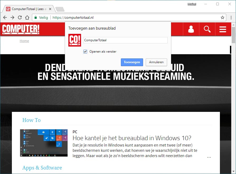 Van iedere veelbezochte website creëer je eenvoudig een snelkoppeling op het bureaublad. Surf naar het juiste webadres en navigeer vervolgens naar Google Chrome aanpassen en beheren / Meer hulpprogramma’s / Toevoegen aan bureaublad. Er opent een klein pop-upscherm waarin je de snelkoppeling een herkenbare naam geeft. Standaard opent de website in een eigen venster, zonder adresbalk of bladwijzerwerkbalk. Start je de website liever in een regulier browservenster van Chrome? Verwijder in dat geval het vinkje voor Openen als venster. Klik als laatste op Toevoegen. Handig voor de herkenbaarheid is dat de snelkoppeling automatisch een bijbehorend pictogram krijgt toegewezen.