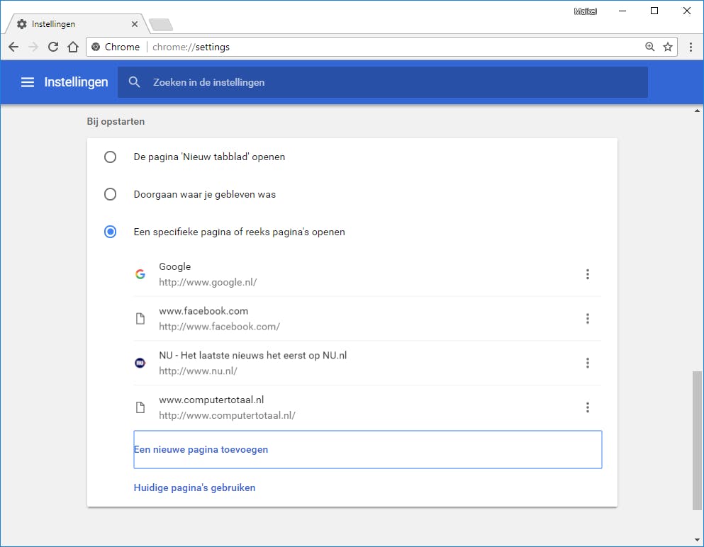 Onder het onderdeel Bij opstarten selecteer je de optie Een specifieke pagina of reeks pagina’s openen. Via Een nieuwe pagina toevoegen vul je een webadres in, waarna je bevestigt met Toevoegen. Herhaal dit proces voor de iedere website waarmee je een surfsessie wilt beginnen.