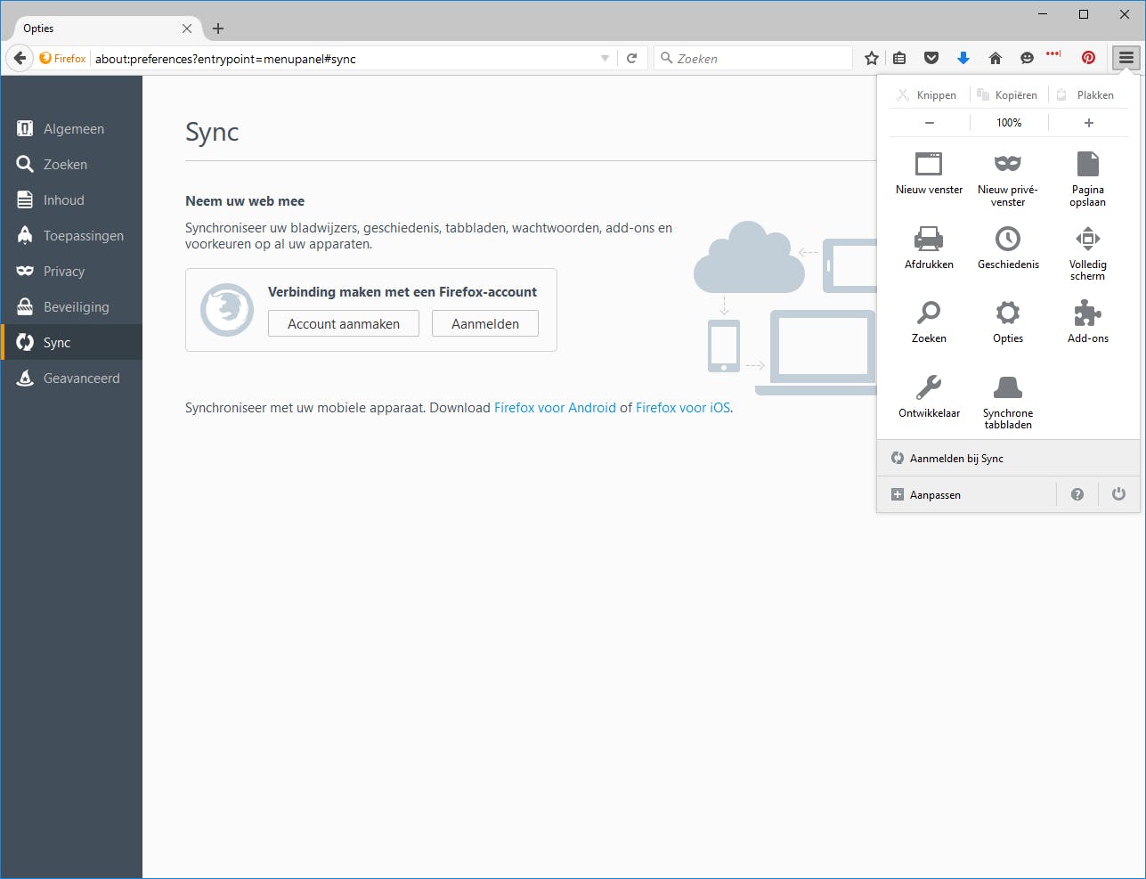 Het fijne van moderne browsers is dat ze de mogelijkheid hebben om gegevens te synchroniseren. Dus stel dat je op je werk Firefox gebruikt en je hebt daar allemaal bladwijzers opgeslagen, dan is het natuurlijk wel zo handig dat je die bladwijzers thuis ook kunt benaderen als je een keertje thuis aan de slag gaat. Dat is dus mogelijk met behulp van synchronisatie. Bij Firefox maak je hier gebruik van door te klikken op het menu en vervolgens op Aanmelden bij Sync. Vervolgens maak je een nieuw account aan of meld je je bij Firefox aan met een account dat je al hebt. Doe dit op alle computers die je wilt synchroniseren. De rest gaat nu automatisch.