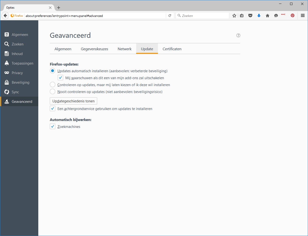 Omdat je met browsers rechtstreeks met internet verbonden bent, is het van groot belang dat deze software regelmatig wordt bijgewerkt. Immers, als er een lek bekend wordt, zullen hackers massaal proberen om dat uit te buiten. Het makkelijkste is om ervoor te zorgen dat de browser zichzelf automatisch updatet, maar wat als je dat niet wilt? In Firefox kun je bepalen hoe de browser zichzelf updatet door in het menu te klikken op Opties en vervolgens op het tabblad Geavanceerd. Klik nu bovenin op het subtabblad Update en bepaal op wat voor manier Firefox de updates mag installeren.