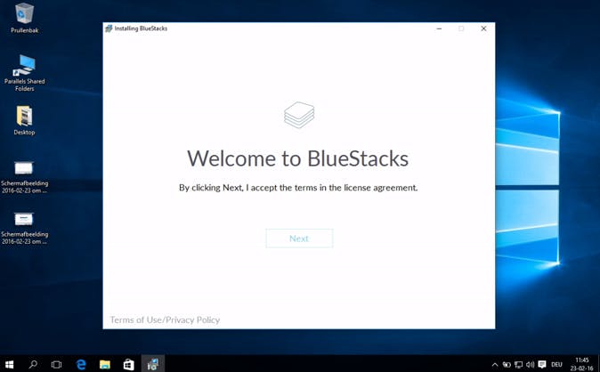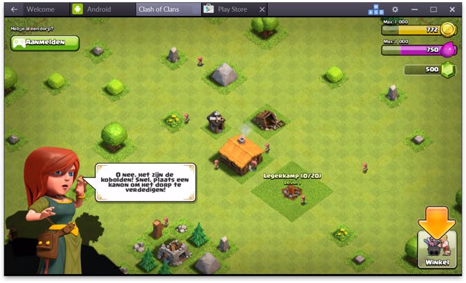 Om BlueStacks 2 te installeren, ga je naar www.bluestacks.com en selecteer je rechts bovenin Nederlands. Klik vervolgens op Download BlueStacks en kies voor Uitvoeren als je browser hierom vraagt. In het eerste scherm vraagt BlueStacks dat je akkoord gaat met de voorwaarden en op Next klikt. Klik ook op de volgende pagina's op Next en laat de vinkjes voor App Store Access en Applications Communications staan. Deze beide onderdelen heeft BlueStacks nodig, zodat je apps kunt installeren op Android. BlueStacks wordt automatisch gestart en je krijgt het BlueStacks-scherm te zien van waaruit je apps en games kunt installeren. Bovenin vind je een paar knoppen om bijvoorbeeld de schermgrootte van BlueStacks aan te passen en door op het tandwiel te klikken, kom je bij de instellingen en andere configuratieopties. Aan de linkerkant kom je nog een paar andere BlueStacks-knoppen tegen, hier gaan we later verder op in.