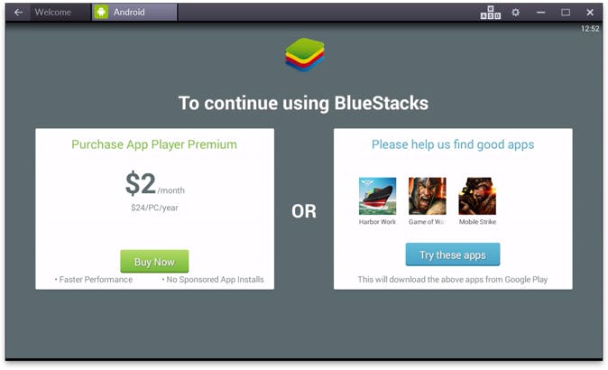 Het programma is gericht op het draaien van apps en games, en het geeft je suggesties welke apps je kunt installeren. De meeste apps draaien vlekkeloos, maar dit heeft uiteraard wel te maken met de kracht van je host-systeem. Heb je een oude bak, dan zal BlueStacks hier niet fijn op draaien. Het enige nadeel van de software is de vrij agressieve manier om je ervan te overtuigen om over te stappen op een betaald Premium-abonnement, in het kader Premium lees je meer hierover. BlueStacks 2 is voor zowel pc als Mac beschikbaar.