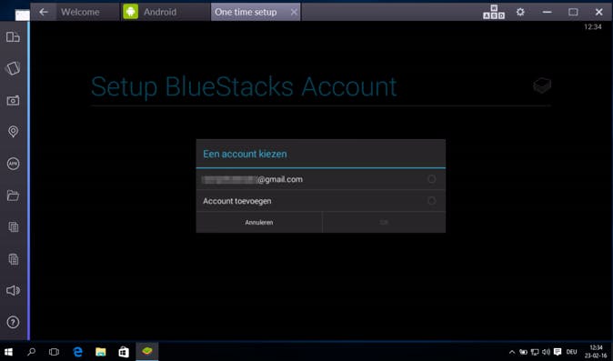 De volgende stap is om een BlueStacks-account op te zetten, klik weer op Continue. In de meeste gevallen zul je maar één Google-account gebruiken in BlueStacks, klik daarom op je zojuist geconfigureerde Google-account en klik op OK. De derde stap is om App Sync te activeren. Dit is een dienst die BlueStacks nodig heeft om te functioneren. Klik op Continue, je wordt naar een Google-inlogpagina gebracht en hier moet je nog eens op Volgende klikken. Geef opnieuw je Google-accountwachtwoord in en klik op Inloggen. Na een paar seconden word je naar de BlueStacks Android-omgeving teruggebracht en klik je op Let's go om de registratie af te ronden. Deze configuratie hoef je slechts één keer te doen, daarna wordt je account voor al je downloads gebruikt.