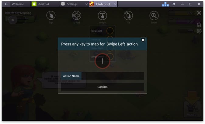 Een groot verschil tussen een echt Android-apparaat en een virtuele versie op je pc, is dat op een echte apparaat games en apps met veeg- en knijpbewegingen worden bestuurd. Dit is natuurlijk niet mogelijk met je normale pc of laptop. Vandaar dat je bovenin een knop vindt om je toetsenbord of controller toe te wijzen aan functies van een game of app. Klik op het WASD-icoon bovenin en over de game of app verschijnen een paar opties. Klik op het potloodje om andere bewegingen toe te wijzen aan toetsen op je toetsenbord. Bovenin zie je de bewegingen die je met je smartphone of tablet zou kunnen maken. Klik bijvoorbeeld op Swipe en er verschijnen vier opties: Swipe Left, Swipe Up, Swipe Right, Swipe Down. Klik op één van de opties en in een pop-upscherm kun je op een toets van je toetsenbord drukken. Nu is deze toets aan de functie in Android toegewezen.
